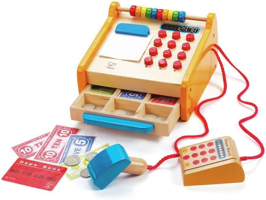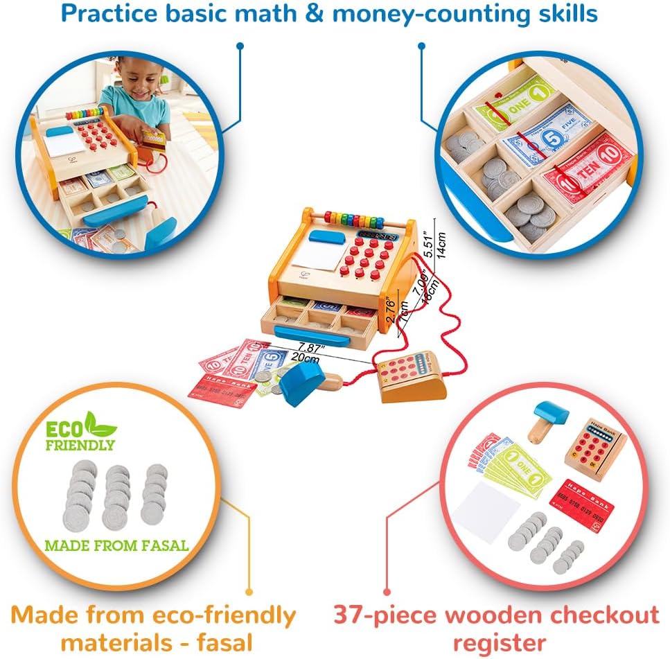 Hape Checkout Register, Kids Wooden 37-Piece Pretend Play Cashier Set with Calculator Function
